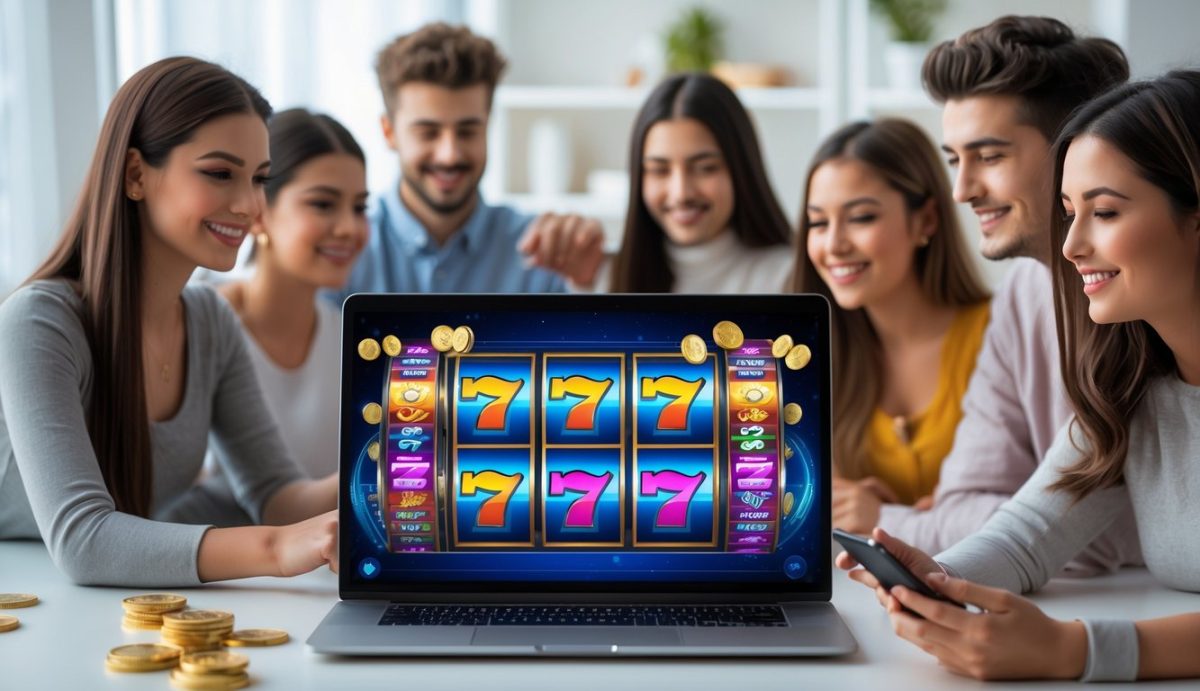 Sekelompok orang muda sedang bermain permainan slot online di perangkat digital dengan ekspresi senang dan fokus.